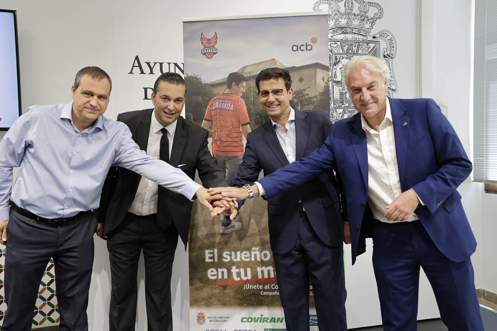 La presentación de la campaña de abonados ha sido realizada en el Ayuntamiento de Granada y ha contado con la presencia del alcalde de Granada, Paco Cuenca, el concejal de Deportes, José Antonio Huertas, el director General de Coviran, José Francisco Muñoz, y el presidente de la Fundación CB Granada, Óscar Fernández-Arenas.