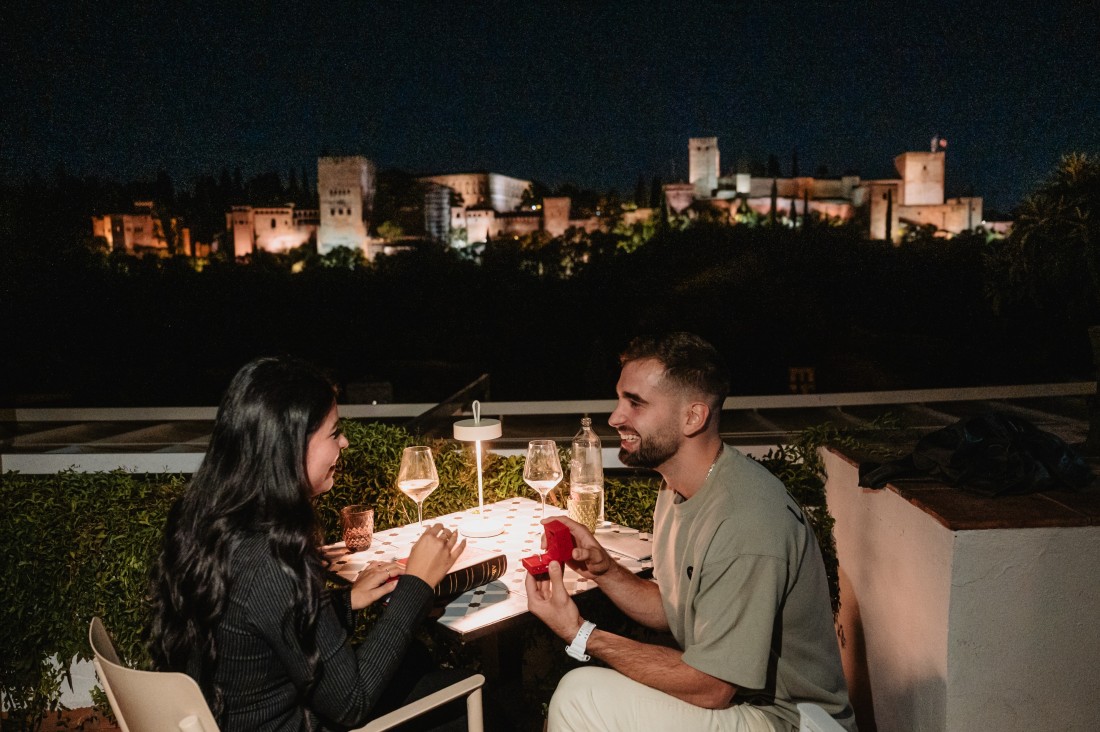 Kljajic eligió el Mirador de Aixa para sorprender a su pareja y pedirle la mano en la terraza de este conocido restaurante del Albaicín, un enclave conocido por ofrecer una panorámica inmejorable de la Alhambra, que fue testigo de este bonito instante.