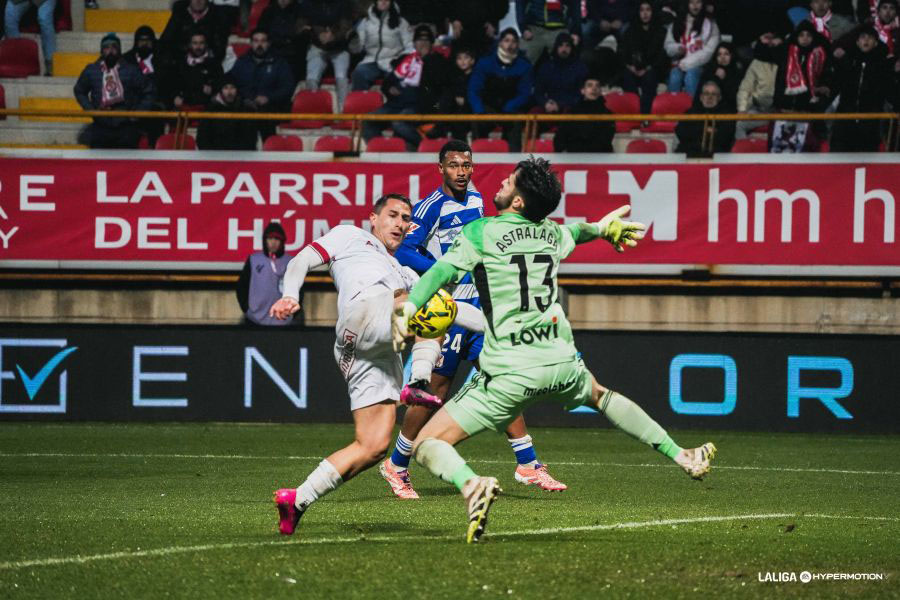 El arquero vasco realizó un total de cuatro paradas durante el choque, una de ellas impresionante, al meter una mano abajo en un disparo seco de Tresaco. La acción, en la recta final del encuentro, pudo suponer la igualada para los locales.