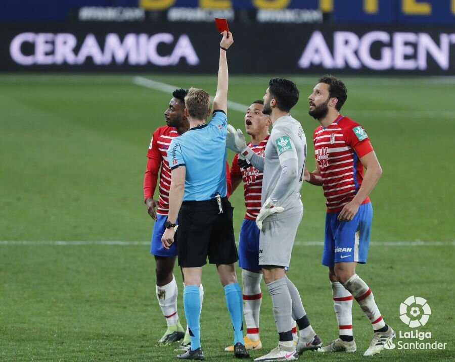 Cuando parecía que sólo había que lamentar la lesión de Max Gonalons (y decimos “sólo” porque la indisponibilidad de futbolistas ha sido la tónica habitual del Granada durante la presente temporada), las decisiones de Valentín Pizarro Gómez ayer provocaron que tampoco puedan estar en Pamplona Yangel Herrera y Yan Eteki. El primero vio su quinta amarilla pasada la media hora por una entrada clara sobre Manu Trigueros, y el segundo fue expulsado con roja directa en el descuento ante las protestas por el penalti señalado que, posteriormente, detendría Rui Silva.