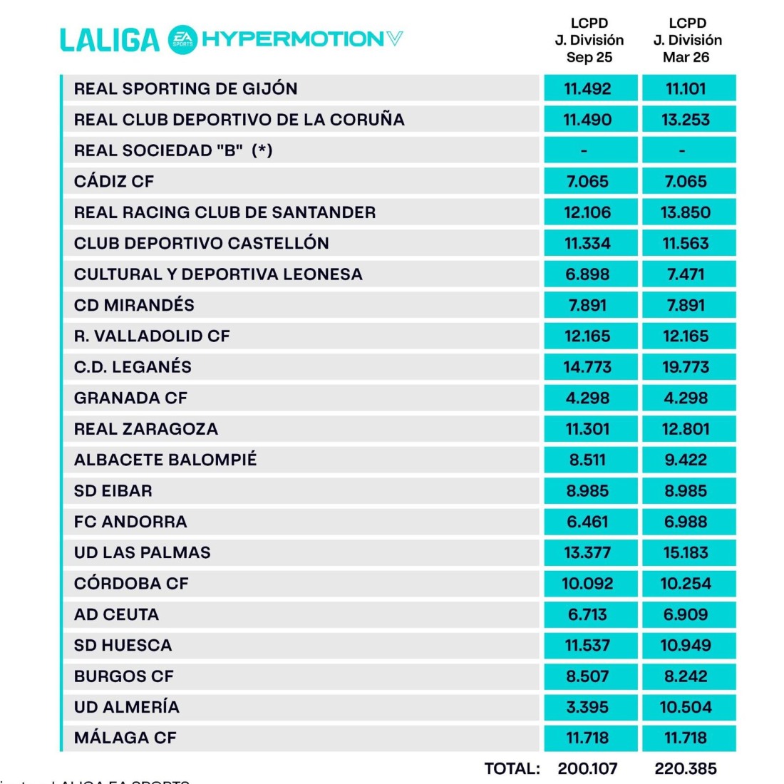 Significativo ha sido el incremento del Almería, que ha pasado de 3,3 millones en septiembre a los 10,9 en marzo de 2026, una mejoría que no ha podido experimentar el Granada, que sigue ahogado y sin apenas margen de maniobra.