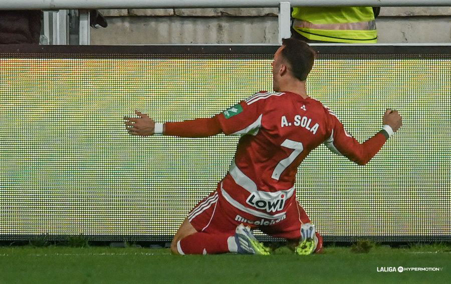 Álex Sola, ubicado en su posición natural como extremo derecho, rindió mejor que en partidos anteriores, donde jugaba de carrilero por la izquierda. El exjugador del Getafe demostró ganas e implicación, mostrando buen ritmo, regate y estado físico, siendo uno de los jugadores más activos en ataque durante el encuentro. De su pierna derecha partió el potente disparo cruzado en carrera que perforó la portería del Burgos, su primera contribución directa en esta temporada 2025/2026. Pocos minutos después de marcar, tuvo que abandonar el campo por molestias en el muslo derecho, lo que supone un contratiempo para el equipo.