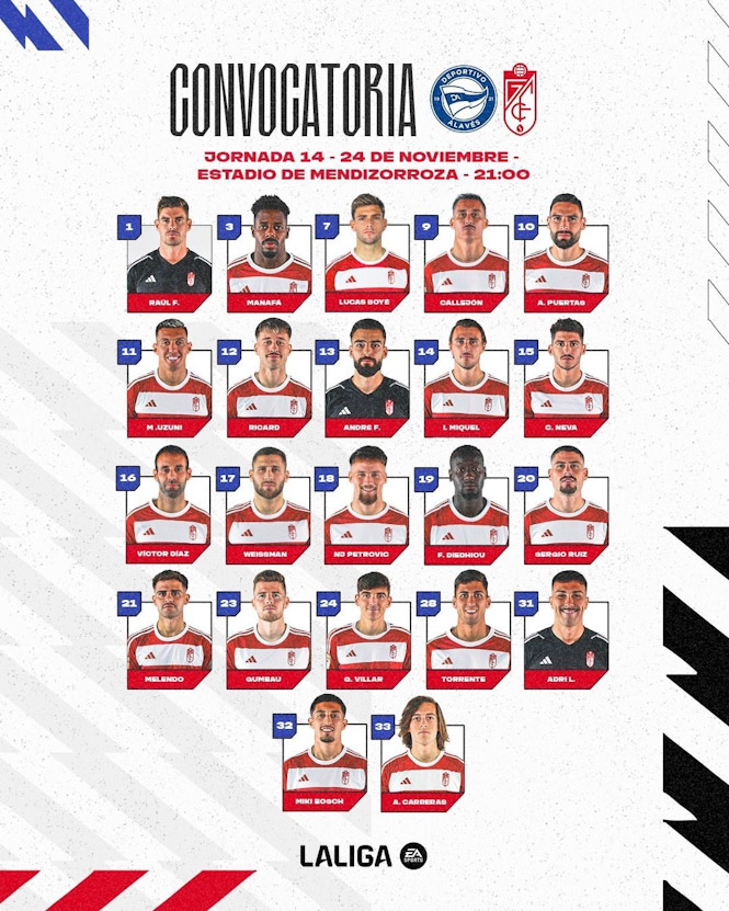 El Granada CF ha publicado, en la mañana de hoy, su lista de convocados para el duelo de esta noche ante el Alavés.