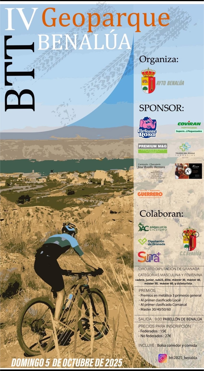 El próximo domingo 5 de octubre, el municipio de Benalúa será protagonista del mejor BTT granadino con la disputa de la IV BTT Benalúa Geoparque Granada, una prueba puntuable para el Circuito Provincial Diputación de Granada BTT Media Maratón 2025 que recorrerá un trazado de 47,56 kilómetros.