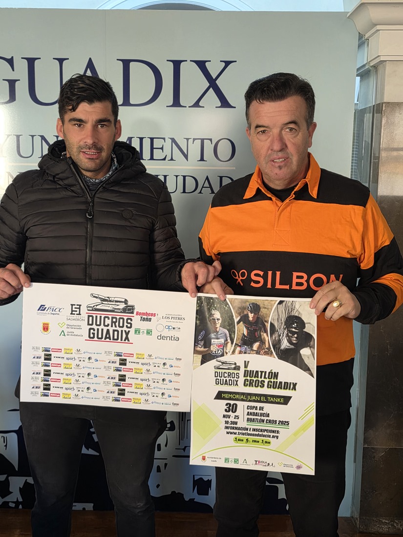 El concejal de Deportes del Ayuntamiento de Guadix, Jesús Samaniego, y el promotor y organizador Alex Salmerón presentaron esta mañana la quinta edición del Duatlón Cros de Guadix, que este año formará parte de la Copa de Andalucía.