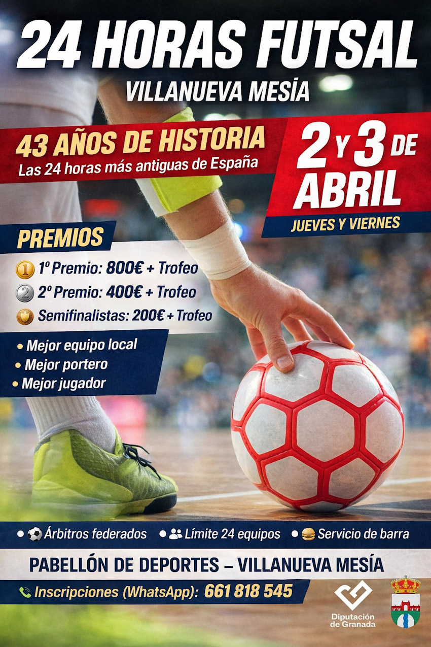 Villanueva Mesía acogerá los próximos 2 y 3 de abril una nueva edición de las tradicionales 24 Horas de Futsal, un evento deportivo que alcanza ya sus 43 años de historia y que se consolida como uno de los torneos más veteranos de España en esta modalidad.