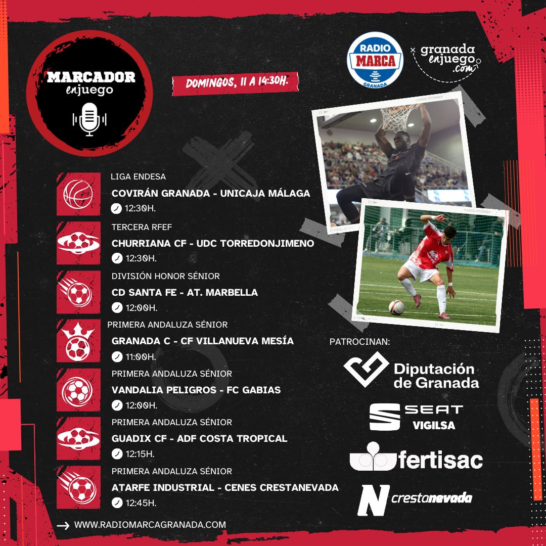 El deporte granadino vuelve a ser protagonista este domingo en MarcadorEnJuego, el programa de referencia del fin de semana en Radio MARCA Granada, que emitirá en directo de 11:00 a 14:30 horas con un completo seguimiento a los principales eventos de la mañana dominical.