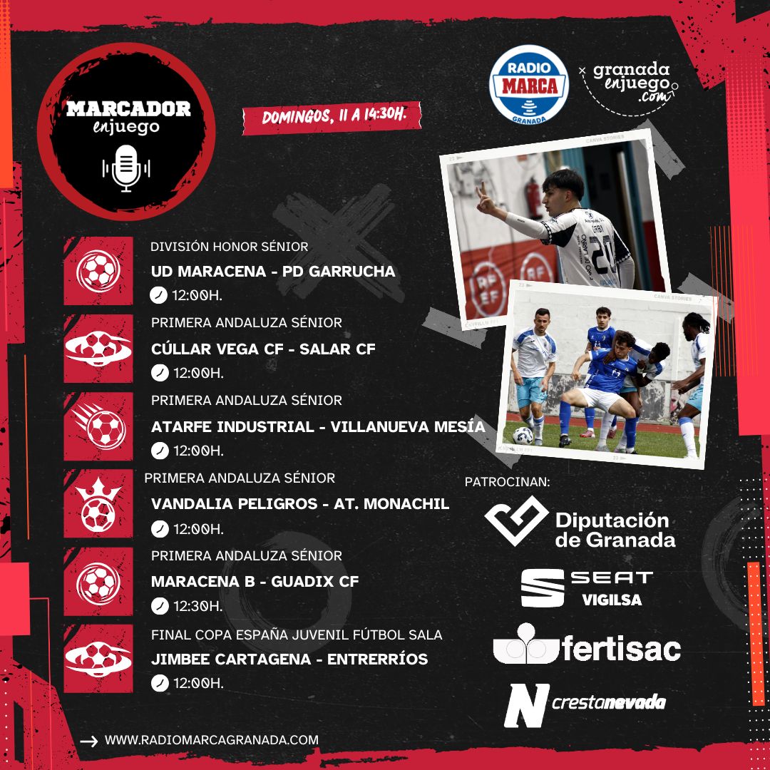 Con conexiones en directo desde los campos, protagonistas tras los encuentros y actualización constante de resultados, MarcadorEnJuego volverá a convertirse en el altavoz del deporte granadino como cada domingo, acercando toda la emoción del fin de semana a los oyentes a través de la radio y las plataformas digitales. Coordinado por Javier Palma desde los estudios de Radio MARCA Granada, la producción de GranadaEnJuego y con el patrocinio de CrestaNevada, Fertisac y Seat Vigilsa.