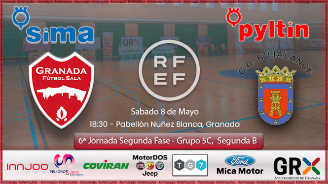 El encuentro, entre el SIMA Granada Fútbol Sala y CD Bujalance F.S. correspondiente a la 6ª jornada de la segunda fase del Campeonato Nacional de Liga en la matriz C del Grupo V de Segunda División B arrancará este sábado, 8 de mayo, a las 18:30h. en el pabellón Núñez Blanca de Granada. El partido será retransmitido a través de televisión en TG7 Granada y en streaming a través de RFAF Tv.