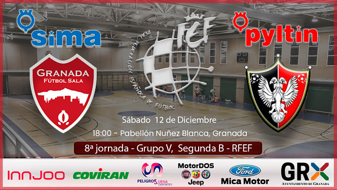 El encuentro correspondiente a la 8ª Jornada de la Segunda División B Grupo V, entre el SIMA Granada FS e Imperial CD, se disputará el Sábado 12 de Diciembre a las 18:00h. en el Pabellón Núñez Blanca de Granada capital. El partido será retransmitido por televisión a través de TG7 y online a través de RFAF TV.