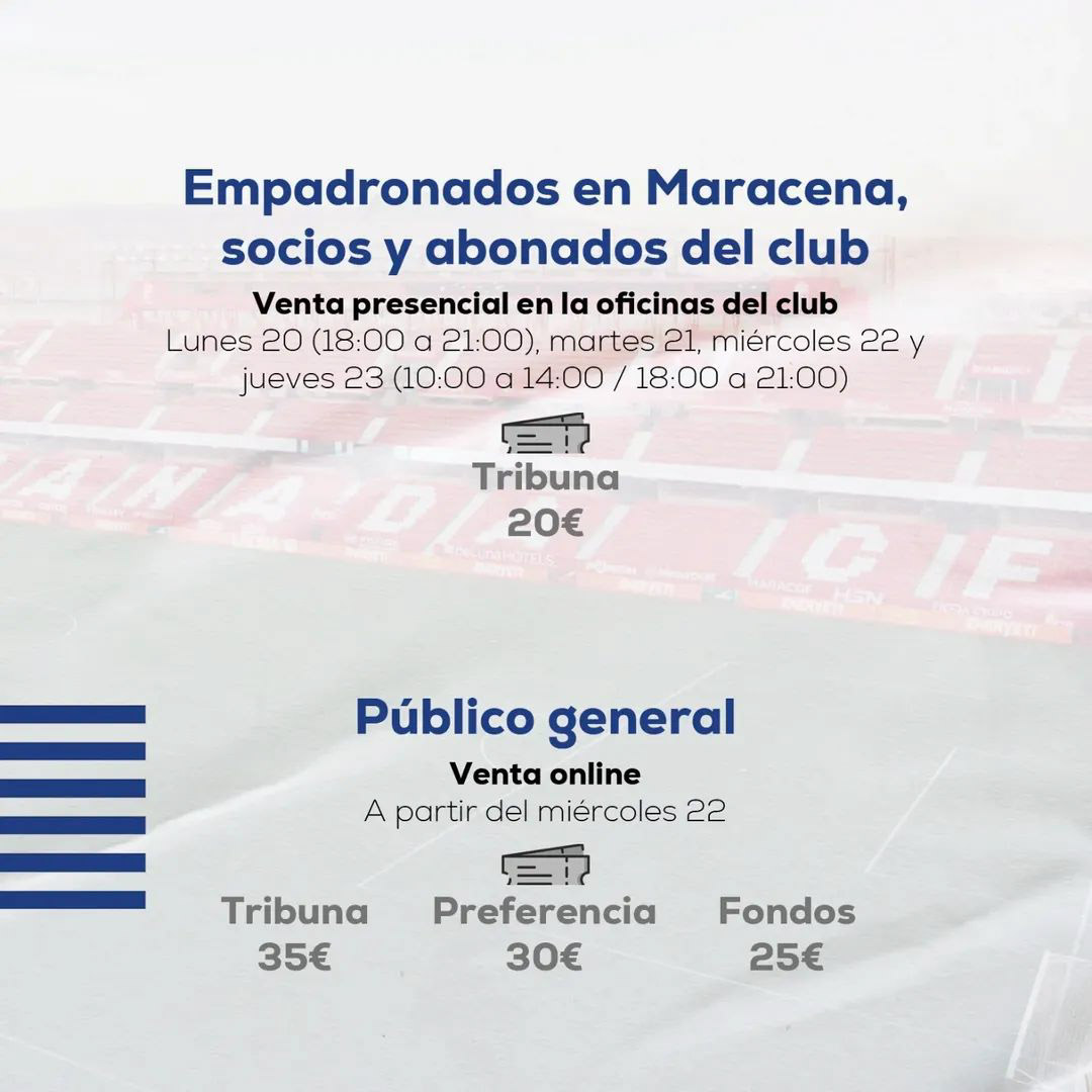 Los empadronados en Maracena, socios y abonados del club podrán adquirir sus localidades de forma presencial en las oficinas del club desde este lunes 20 de octubre. Los horarios de atención serán el lunes de 18:00 a 21:00 horas, y del martes 21 al jueves 23, en horario de 10:00 a 14:00 y de 18:00 a 21:00 horas.